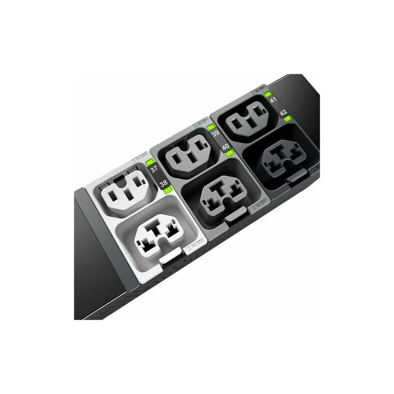APC NetShelter Rack PDU Advanced provide reliable power distribution to IT Equipment within server and/or networking racks. PDU level power metering via remote access and local display for power visibility and notification of potential overload. 4-in-1 combination outlets which can be used as either C13, C19, C15, or C21 outlets provide unparalleled deployment flexibility. Maximum outlet density with 42 outlets in a 2.2" wide form factor. Outlets on the PDUs are color coded and/or labeled by breaker and input phase on 3 phase models to simplify deployment. Provides an alternating phase design whereby each of the 3 phases are organized into small outlet groups which alternate from top to bottom of the PDU to facilitate better power cord management and promote better load balancing. Power Sharing allows PDUs cascaded together via 2 ethernet ports enable an Network Management Card to continue functioning in the event of an AC power loss. No interruption in Network communication, sensors operation, and alarm traps. Live Swap Network Management Card (NMC) which can be replaced without powering down the PDU or connected devices to minimize downtime in the unlikely event of an NMC power event. Rated and approved to operate up to 60C (140F) at full load ensures reliability and availability even in today's high density deployments. Gigabit ethernet to enhance and standardize network connectivity across all assets in the data center. A second ethernet port (10/100) is available to allow cascading to other PDUs, connect to a 2nd private network, or provide network redundancy. 1% metering accuracy for the peace of mind to use NetShelter Rack PDU Advanced to bill based on power usage. In addition, the higher level of accuracy ensures the most precise measures for capacity planning and threshold alarm monitoring. Two environmental sensor ports allow for optional sensors (sold separately) to be connected. For data center deployments across multiple regions, these PDUs are both UL and CE rated providing one PDU that can be used globally to simplify and standardize deployment.