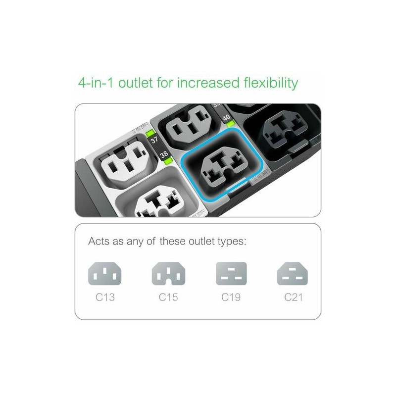 APC NetShelter Rack PDU Advanced (11K Series) provides reliable power distribution to IT equipment within server and/or networking racks. PDU level power metering provides power visibility and notification of potential overload. 4-in-1 combination outlets which can be used as either C13, C19, C15, or C21 outlets provide unparalleled deployment flexibility. Maximum outlet density with 40 outlets in a 2.2 in. (5.6 cm) wide form factor allows for more equipment in the rack. Outlets on the PDUs are color coded and labeled by breaker. Live Swap the NMC3 to minimize downtime in the unlikely event of an NMC power event. The rack PDU integrates with EcoStruxure IT through an NMC3 and can be accessed and configured via web, SNMP, and command line interface (CLI). A 10-foot (3-meter) input cord makes it easier for the PDU to reach the power supply. Rated to operate up to 60 C (140 F) at full load ensures reliability and availability even in today's high-density deployments. One gigabit Ethernet/network port (10/100/1000) enhances and standardizes network connectivity. Two link ports are available to cascade to up to 32 PDUs, with a network port sharing (NPS) feature to enable power sharing between Rack PDUs in the cascading group. Track or bill power usage confidently with 1% metering accuracy. Two environmental sensor ports allow for optional sensors (sold separately) to be connected. For data center deployments across multiple regions, these PDUs have the following certifications: UL, CE, CSA, UKCA, Nemiko, PSE, KC, China RoHS, RCM, and CMIM. This models input power cord is IEC-309 32 A and features 20 count C13/C15/C19/C21 combo outlets and 20 count C13/C15 outlets.